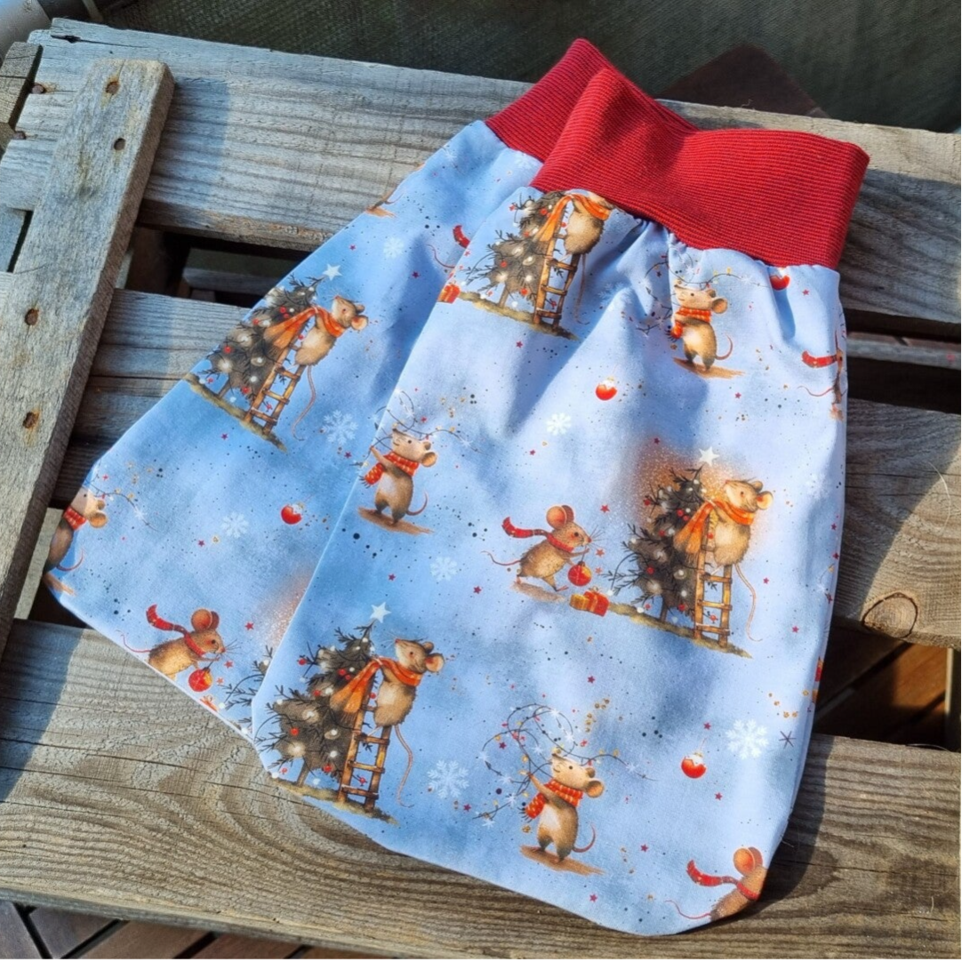 Motiv: Waldweihnacht der Mäuse. Bündchen in dunkelrot.